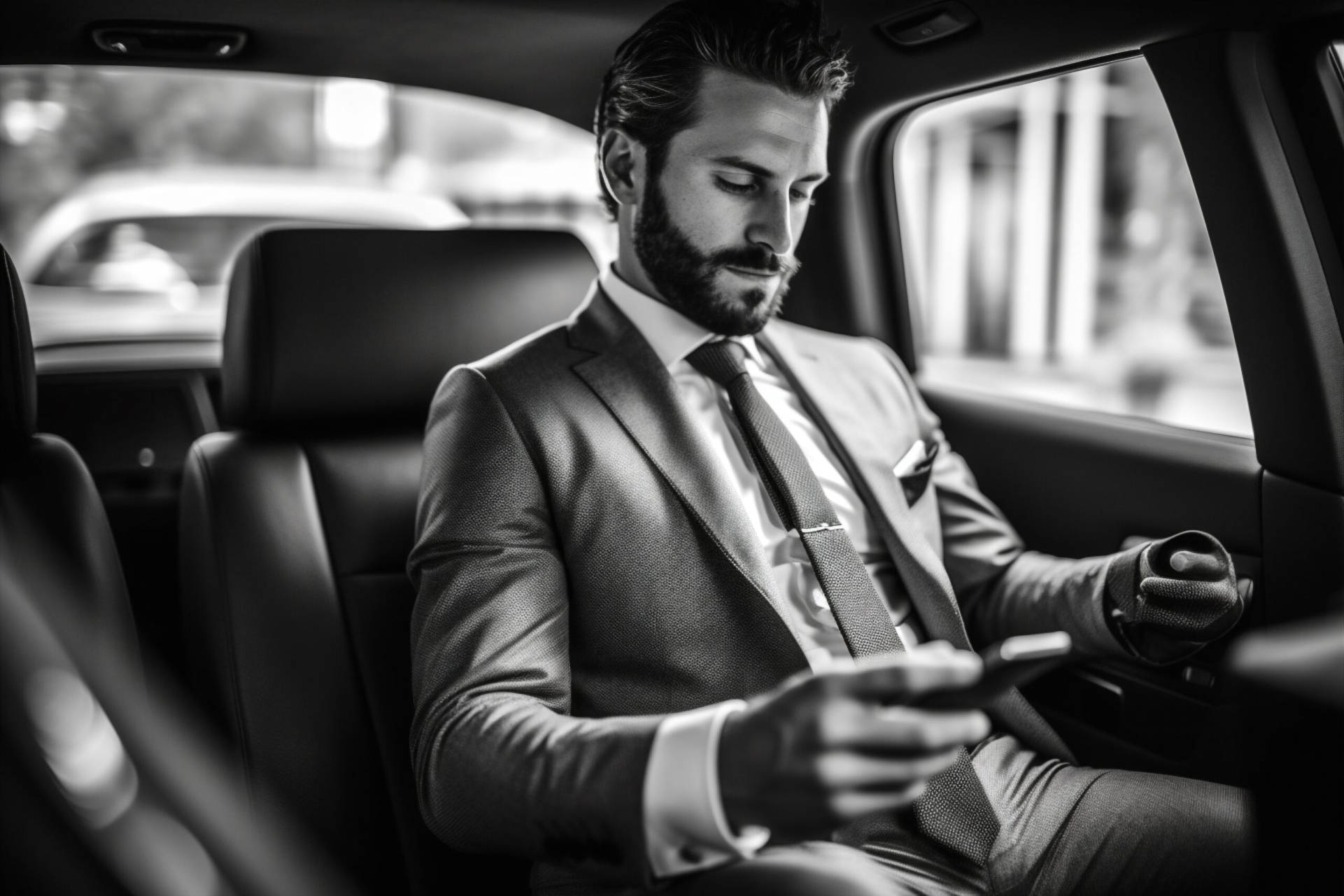 businessman adult car transportation men young inside phone business seat driving. Generative AI.